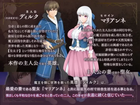 拯救过世界的勇者迪尔克,在击败魔王后被封为皇太子。然而,未来的皇帝不能与平民通婚,迪尔克的愿景终究无法实现。懊恼之下,迪尔克决定不放弃心爱的玛丽安妮,希望带着她一同逃离。 他放弃了身份地位,和玛丽安妮在乡下的小村庄里过上了平凡的生活。他们原以为能够安稳度日,将纷扰抛诸脑后,但乡村生活也有独有的难题等待着他们——两个心怀希望的人,能否共同克服困难,找到属于自己的真正幸福?
