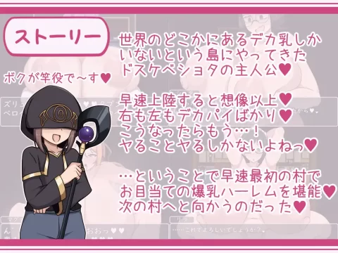 ■概要 主角是一个好色小正太,他来到了这个世界某个地方的一个岛屿,据说岛上只住着巨乳女性。 他一上岸,就看到了超乎想象的巨乳!除了做爱还能做什么呢! ……于是他立刻在第一个村庄里尽情享受了目标爆乳女孩的后宫,然后前往下一个村庄! ■游戏内容 本作是续作,但即使对前作一无所知也能享受乐趣!! (本作没有任何战斗和升级元素!) 操作小正太主角探索城镇,寻找目标女孩的秘密。 游戏流程是揭露秘密,然后对女孩进行催○,让她言听计从。