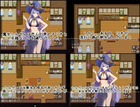 ◆故事 魔女希尔维和恋人里奥过着平静的生活。然而,有一天,里奥染上了流行病倒下了。希尔维寻找治疗方法,但她对人类的事情不甚了解,于是向像往常一样来家里拜访的色小鬼加隆求助。加隆答应帮忙,但却提出了回报。 ◆系统 有探索日和休息日。 探索日时,希尔维会前往地下城。每个地下城都有任务,如果失败,回家就会晚,必须向色小鬼道歉。→色情事件 休息日时,色小鬼会来家里拜访,纠缠希尔维。色小鬼的目标是希尔维的身体,所以如果选择错误,就会被他得逞。→色情事件