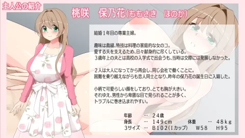 桃咲保乃花是結婚第一年的全職主婦。 在新家整理搬家行李時, 她發現了丈夫偷偷藏起來的成人錄像帶。 "露出"這個陌生的詞語讓保乃花十分在意其內容,於是播放了DVD, 雖然對這個未知的世界感到困惑,卻也莫名地感到興奮。 對丈夫從未展現過的性癖感到動搖的同時, 為了更理解丈夫,保乃花 自己打開了名為"露出"的性癖之門…