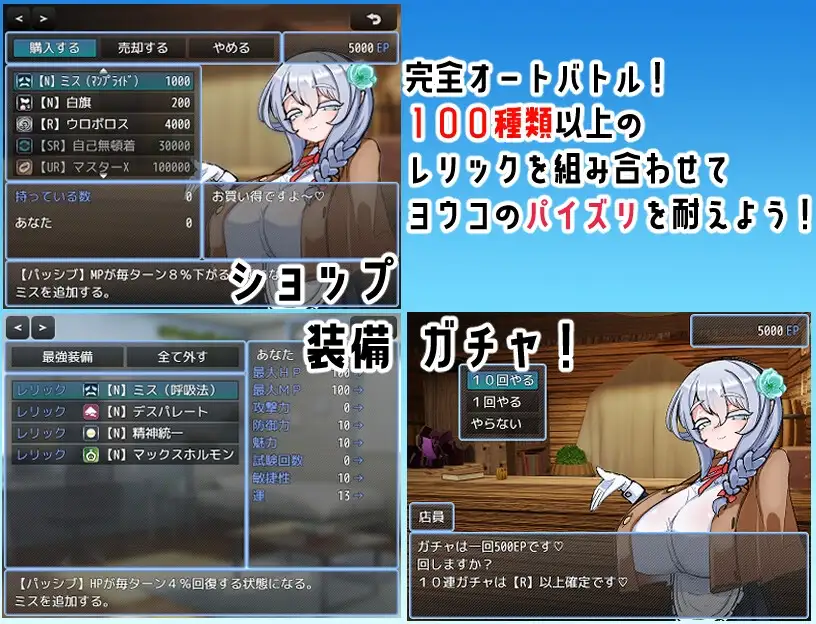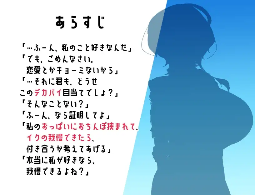 忍住乳内射精,向憧憬的那个女孩传达心意的RPG。 本作品的H场景全为乳交。 (也有着衣乳交。) 基本CG 26张 CG总数超过400张 画面尺寸816*624 本游戏使用RPG製作大师MZ制作而成。